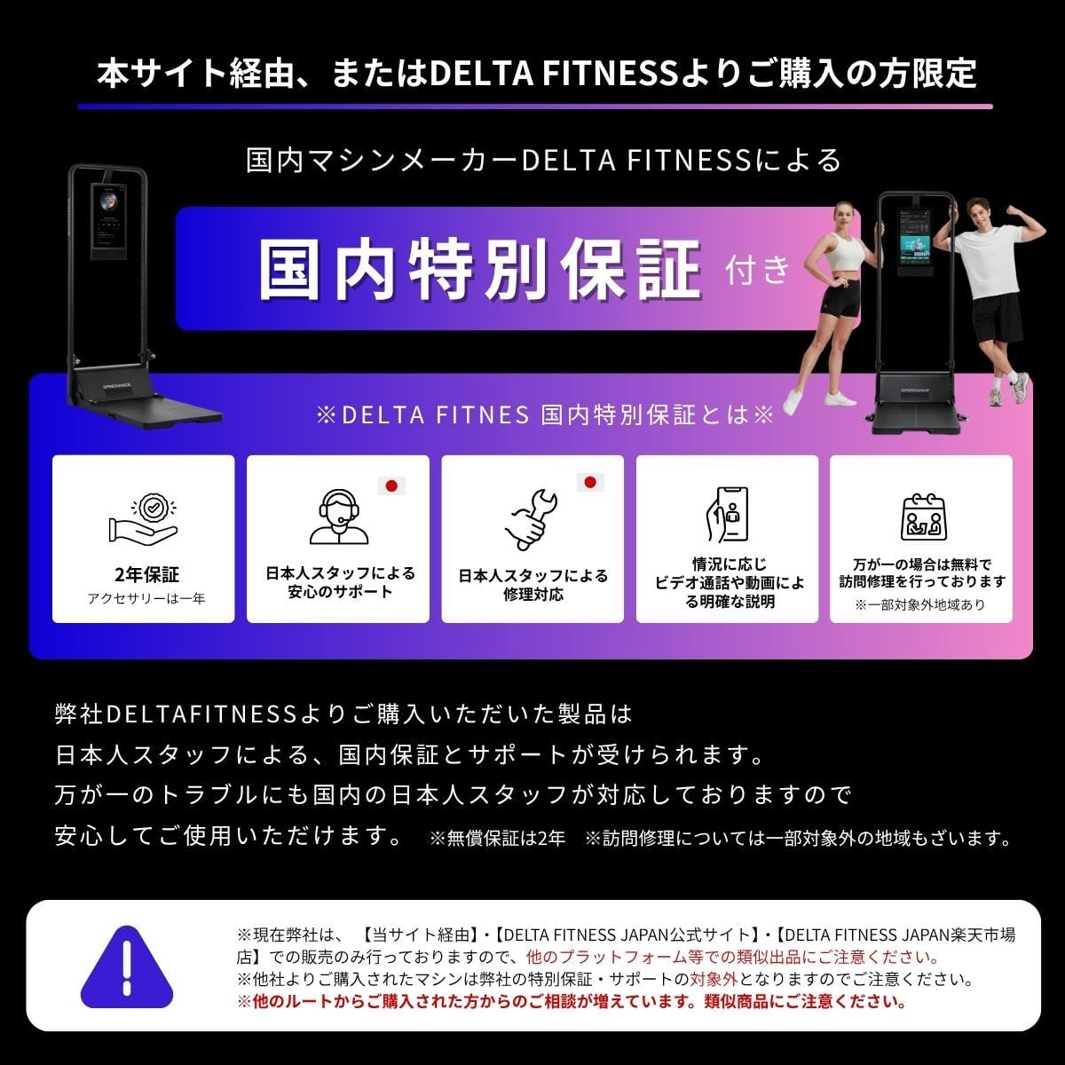 当社、株式会社DELTA FITNESS が日本正規販売店となります。他社で購入されたマシンは正規とは異なるルートで仕入れた物となりますので、万が一不具合が発生した場合の国内メーカー保証は受けられませんのでご注意ください。